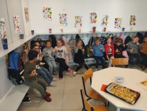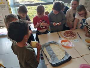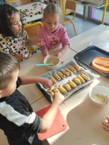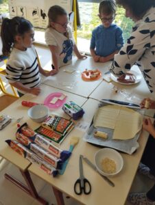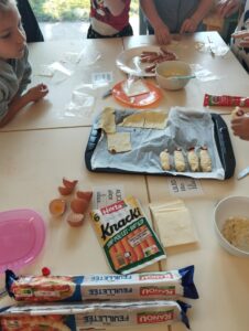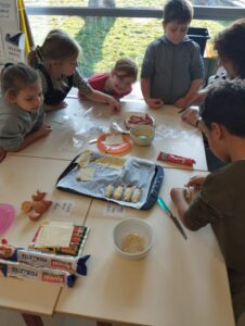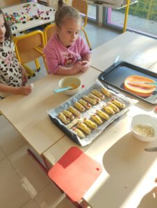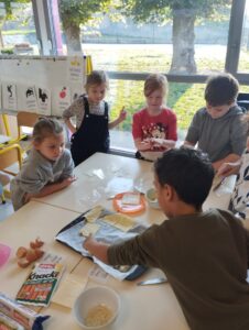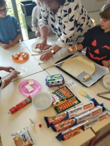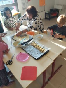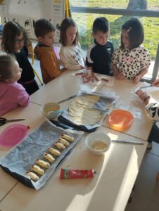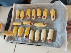 En ce dernier jour d’école, veille de vacances, nous avons célébré cette fin de première période avec un atelier cuisine particulier.. Au menu, des « Doigts de sorcière », avec ongles purulents et incarnés! Toutefois un vrai régal en définitive 😉