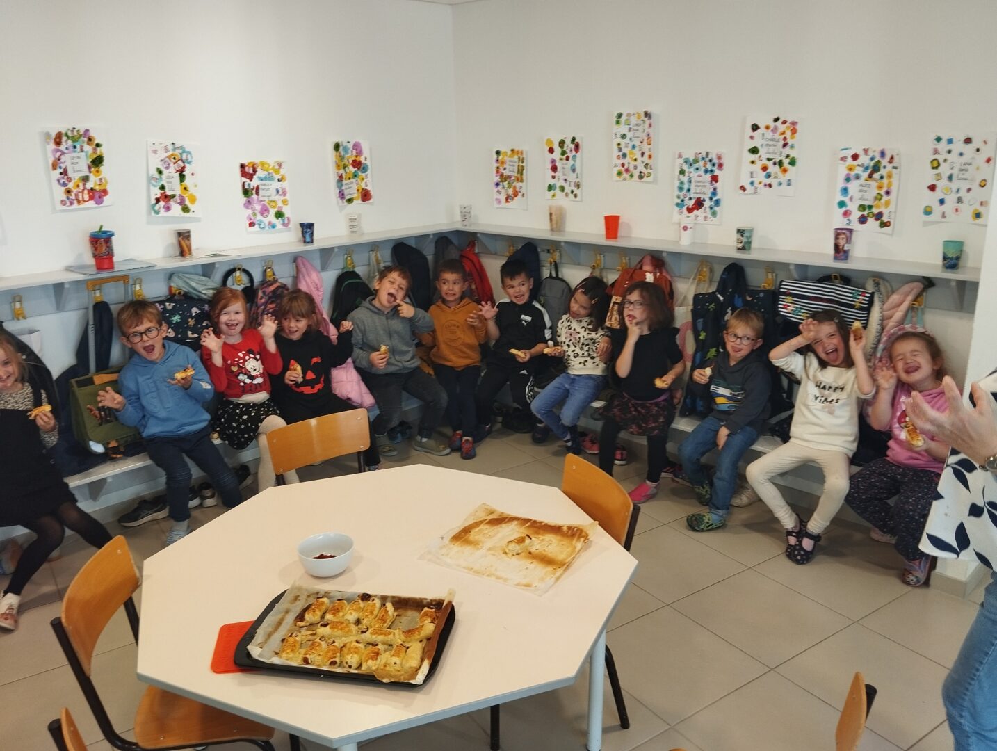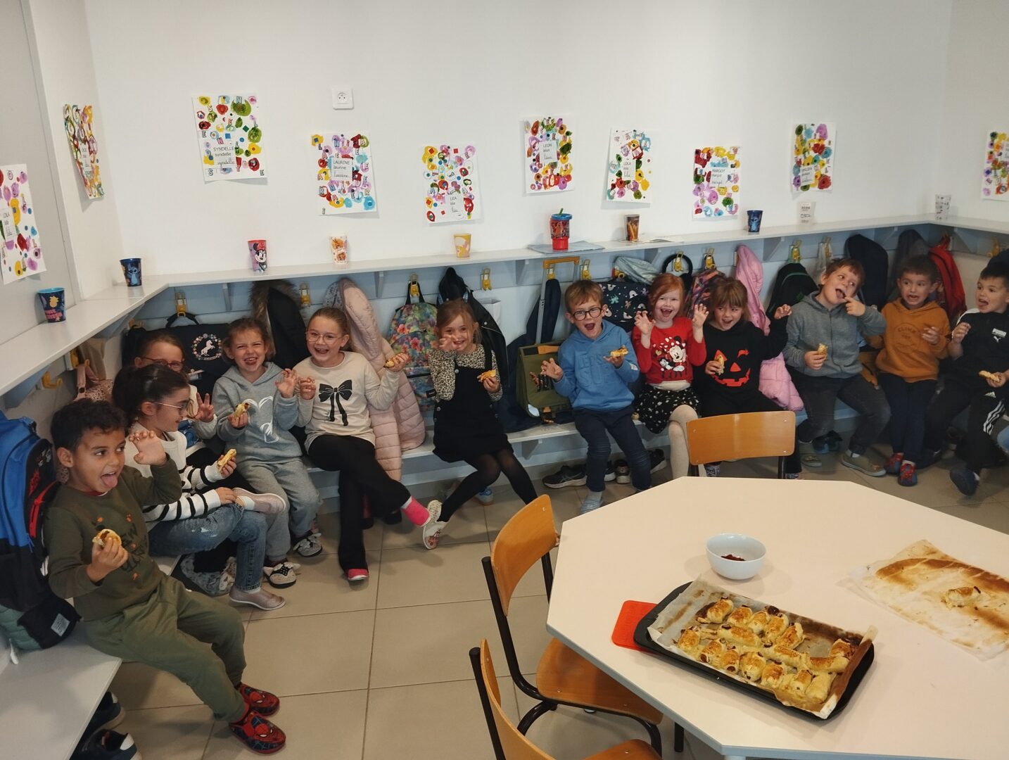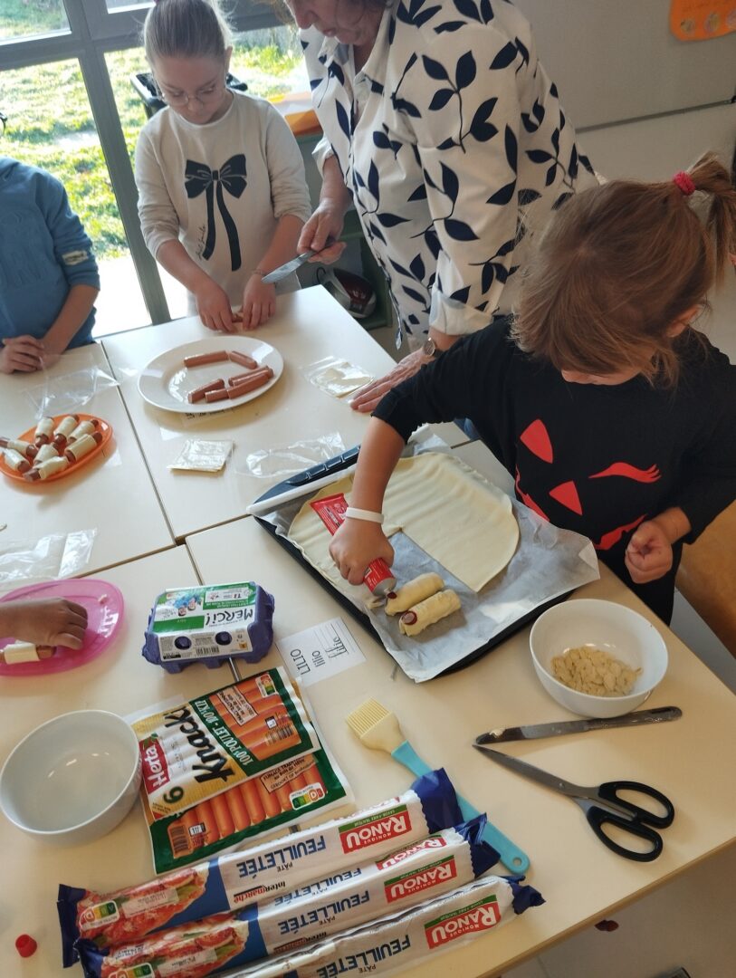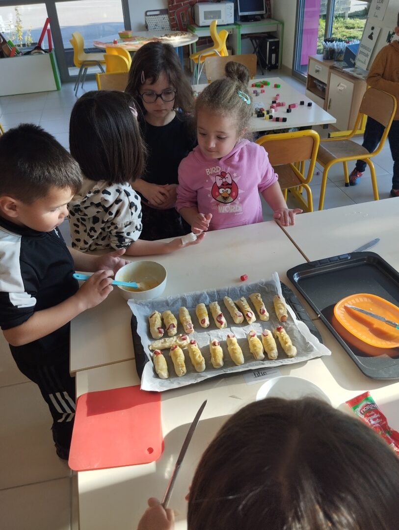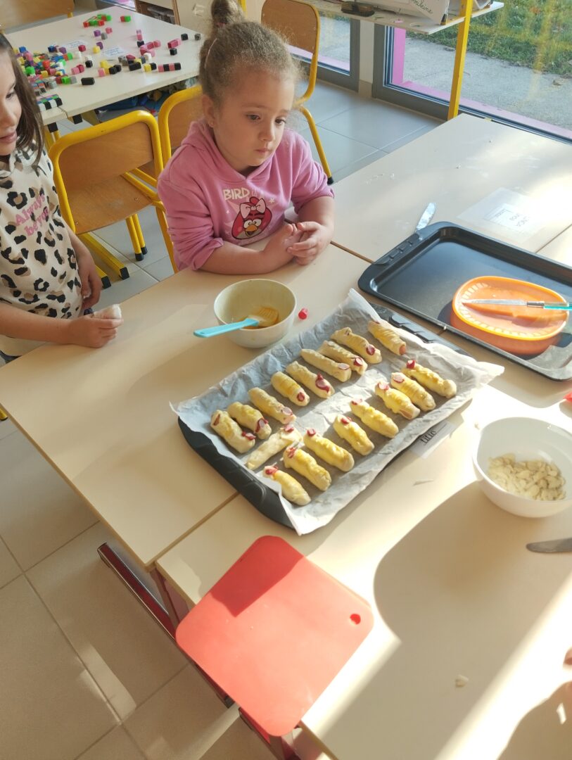 En ce dernier jour d’école, veille de vacances, nous avons célébré cette fin de première période avec un atelier cuisine particulier.. Au menu, des « Doigts de sorcière », avec ongles purulents et incarnés! Toutefois un vrai régal en définitive 😉