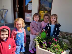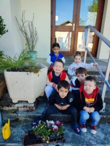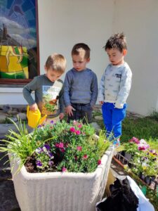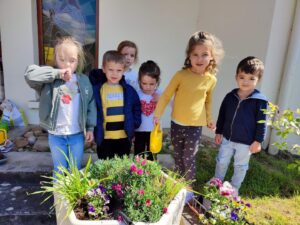 A la fin du mois d’avril, nous avons rempoté des pensées devant l’école.